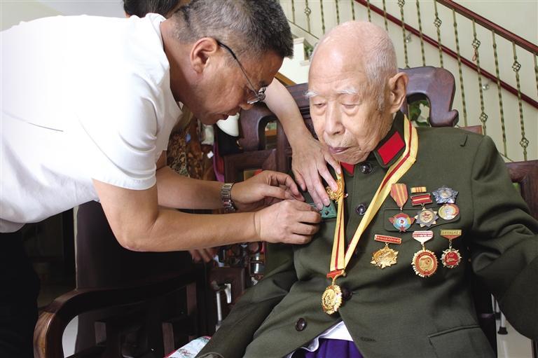 8月22日,99歲的我省抗戰(zhàn)老戰(zhàn)士劉炳榮佩戴國家頒發(fā)的“中國人民抗日戰(zhàn)爭勝利80周年”紀(jì)念章。 本報通訊員 吳寬宏攝
