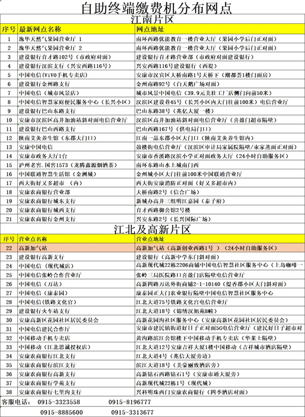 為進一步方便廣大用戶購買天然氣,我公司在電信營業廳、建設銀行、農商銀行及便民服務點等網點布設38臺天然氣自助終端繳費機,F溫馨提示您關注“安康市逸華天然氣有限公司”微信公眾號查看自助機分布網點,選擇就近網點進行天然氣充值。其他業務可在工作時間內前往以下人工服務大廳或窗口辦理,部分業務也可通過微信公眾號的“微營業廳”辦理: