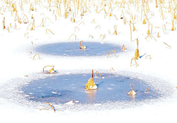 功夫在詩外,藝術皆相通。在西安美院期間,我學習過美術史論,對傳統美學和西方美學有了系統學習和認知,尤其鐘情“以空寫實”的留白意境,“鳥宿池邊樹,僧敲月下門”空靈意境讓我神往。我把美術理論運用到攝影實踐。在拍攝荷塘時,我常借助湖面鏡面反射構建對稱構圖,讓殘陽余暉與湖面蓮藕剪影在虛實間互動;俯拍蓮蓬剪影時,輪廓線條在晨昏光暈中的若隱若現,恰似水墨畫的筆斷意連,在快節奏的現代社會中,我渴望通過鏡頭喚醒觀者對靜謐與永恒的感知。